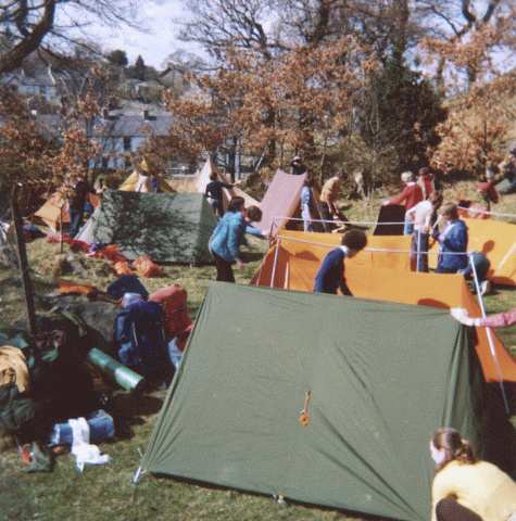 Note General view of groups setting up camp in the grounds of Bryn Ddu base camp Easter 1980 (first year at Bryn Ddu).