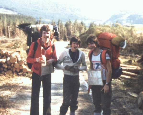Note Group GC near the start of their 1981 expedition, taken in the forest above Dolwyddelan. Shows Richard Vigar, Tony Brand and Paul Guyler.