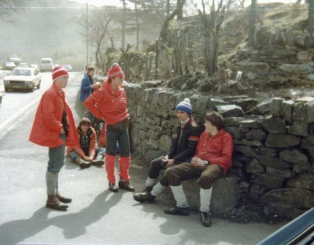 Note Group Gold C at Llanberis check point on their 1982 expedition. Kevan Day, Andrew Johnson, Richard Stevens, Clive Newrick, Mark Watts and Graham Morse.
