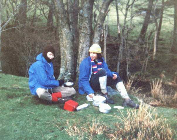 Note Rob Williams and Nick Evans of Silver C cooking meal at Dolwyddelan Castle camp site 1982.